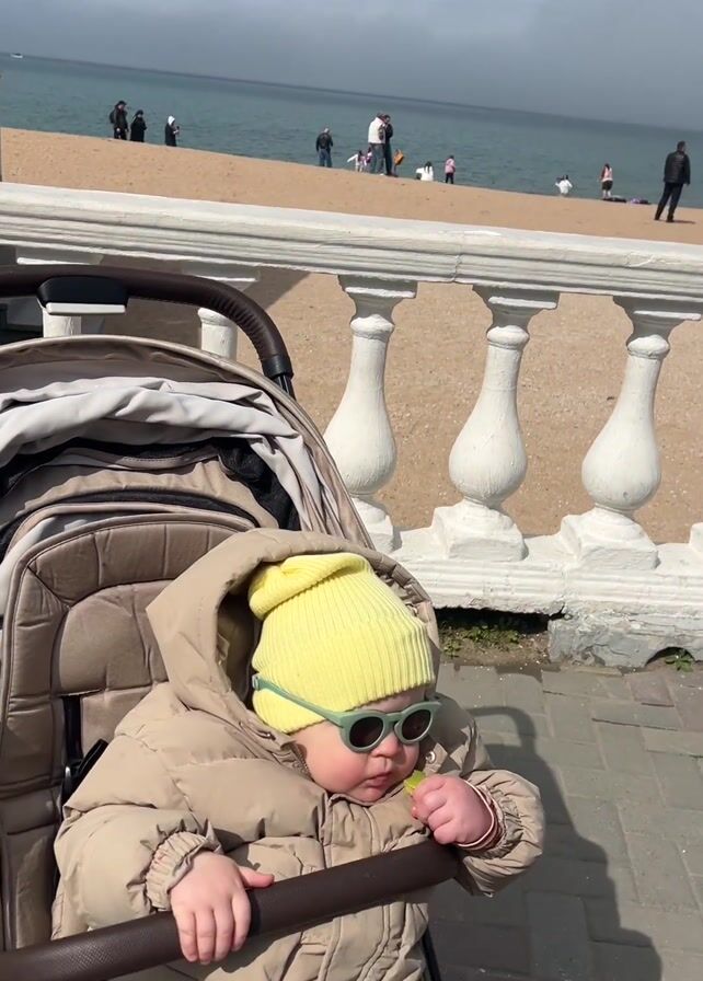 A baby in a stroller is enjoying the view. The infant is wearing a yellow beanie, sunglasses, and a beige jacket. They are holding a small piece of food in their hand. The stroller is parked on a paved walkway next to a white balustrade, with a beach visible in the background. People are walking on the beach near the water, and a small boat is offshore. The sky is overcast.