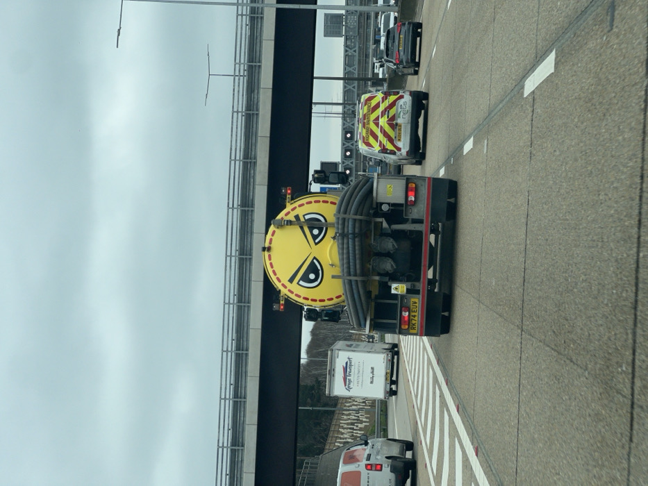 A forensic, matter-of-fact description of the scene follows: The image depicts a multi-lane asphalt motorway under an overcast sky, observed from the perspective of a vehicle in motion. The prominent subject in the foreground is the rear of a yellow tanker truck, registered in the UK with license plate RK74 EUV. The rear face of the cylindrical tank is adorned with a large, stylized cartoon angry face decal in black and white. Below the tank, multiple thick black hoses are coiled horizontally across the rear flatbed of the truck. The truck's rear features red tail lights, amber indicators, and various warning decals. Multiple vehicles are present on the motorway. To the left of the tanker, a white van is partially visible in an adjacent lane. Further left and behind, a white box truck with "Lounge Transport" text and contact details is observed. To the right of the tanker, a white utility van with "HIGHWAY MAINTENANCE" marked on its rear, along with yellow and red chevron reflective tape, is in another lane. This utility van also displays "nets" branding and has a partial registration plate (MJ6...LJK). Behind the utility van, a dark grey Audi SUV is visible. The road surface is asphalt, delineated by white solid and dashed lane markings, and white hatched markings are present on the left side, possibly indicating a gore area or a narrowed lane. An overhead concrete bridge structure with metal railings spans the motorway. Streetlights with distinctive T-bar crossarms are visible along both sides of the road. In the far left background, a wooded area borders a patterned retaining wall or sound barrier. The location is identified as the A3 northbound, within or immediately adjacent to the city of Guildford, Surrey, United Kingdom, characterized by the specific bridge and multi-lane highway infrastructure evident in the image.