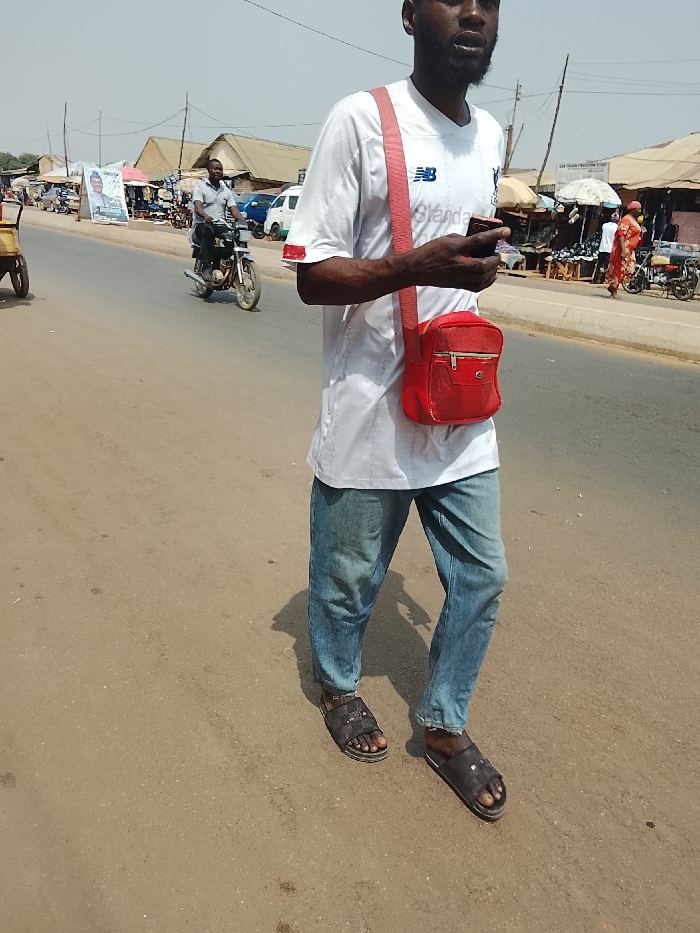 This image captures a daytime street scene in Akwanga, Nigeria. In the foreground, a dark-skinned male, approximately 20-30 years old, stands on an asphalt road. He wears a white short-sleeved t-shirt with "New Balance" and "Standard Chartered" logos, blue denim jeans, and dark sandals. A red cross-body bag with a visible zipper is slung over his right shoulder. He holds a dark-colored smartphone in his right hand, directing his attention to the device. In the midground, a male operates a motorcycle, driving away from the viewer, dressed in a light shirt and dark trousers. To the left, a yellow handcart and a large political campaign banner featuring a male figure are visible, fronting a row of market stalls with corrugated roofs. On the right, additional market stalls, several pedestrians including one in a red patterned garment, and another motorcycle are present further down the road. Overhead utility lines crisscross the upper sky. Strong sunlight illuminates the scene, casting distinct shadows on the ground.