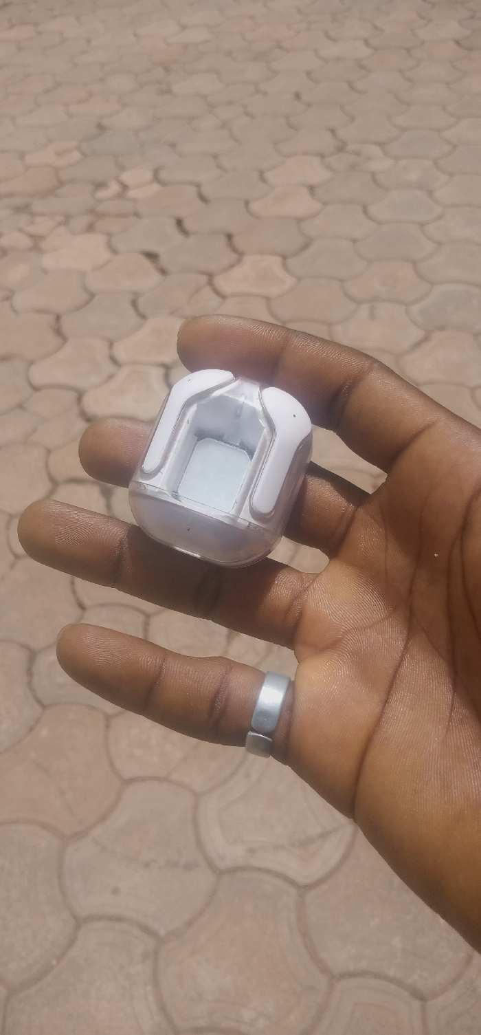 The image depicts a close-up of a person's right hand, characterized by dark skin tone, holding a white and transparent plastic wireless earbud charging case. The case contains two white earbuds, visible through its clear top cover. A silver-colored ring is worn on the ring finger of the hand. The background is an out-of-focus paved surface composed of light brown interlocking pavers, suggesting an outdoor area. The scene is brightly illuminated by direct sunlight. The specific location within the city of Unknown, Unknown, cannot be determined from the provided visual information, beyond being an outdoor paved environment.