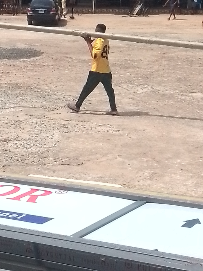 The scene depicts an outdoor, unpaved area in Nkpor, Nigeria, under bright daylight. A young individual, viewed from behind, is walking left to right across a dirt and gravel surface. This individual wears a yellow short-sleeved shirt with the number "81" and an adidas logo visible on the back, dark trousers, and dark flip-flops. They are carrying a long, light-colored cylindrical pole, approximately three meters in length, resting it horizontally across their right shoulder and holding it with both hands. The ground is uneven, showing depressions and small stones. In the mid-ground, a dark sedan is partially visible to the left, facing right. Another person is indistinctly visible near the sedan. Further in the background, to the right of the main subject, another person is partially visible along with what appears to be a metal frame or ladder leaning against an unseen structure. The background includes indistinct structures and possibly sparse vegetation. In the immediate foreground, a large advertising panel is visible. The panel consists of white sections framed by dark grey metal. Red lettering "OR" with a registered trademark symbol and the partial word "nel" are visible on the left section. A dark upward-pointing arrow is present on the right section. The lower frame of the panel displays partially legible text including "POTENTIAL superior quality."