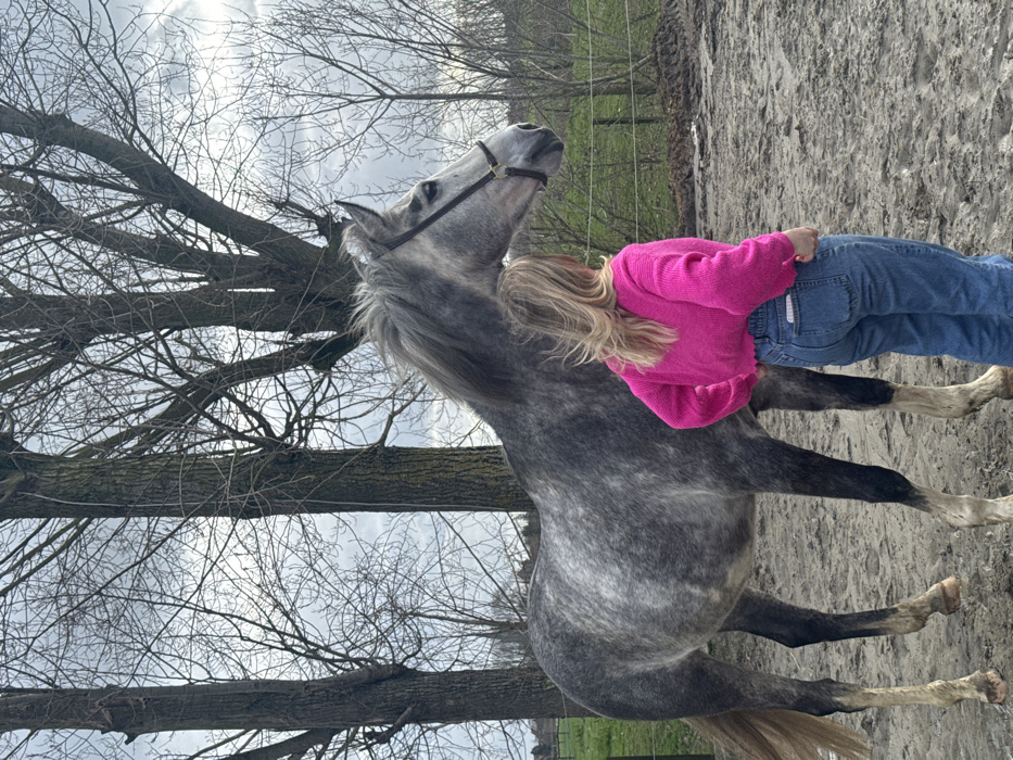 The image depicts an outdoor scene in Estaimpuis, Belgium, featuring one person and one horse. A light-skinned individual, observed from behind, stands with their back mostly to the camera, facing a dapple gray horse. The individual has long, light blonde hair and is wearing a bright pink long-sleeved sweater and blue jeans. Their hands are not visible; the left hand is likely in a pocket or obscured by the sweater, and the right arm is bent at the elbow with the hand near the hip. The horse is a large, dapple gray equine with a dark brown leather halter around its head. Its mane is thick and gray, and its tail is lighter, possibly a flaxen or very light gray color. The horse stands calmly with its head turned slightly to the right, away from the viewer. The ground is a mix of bare earth and mud, indicating damp conditions. In the background, several large deciduous trees with bare branches stand against an overcast sky. A wire fence is visible behind the horse, separating the immediate muddy area from a green grassy field further back. The overall environment suggests a paddock or an outdoor enclosure during a cooler season.