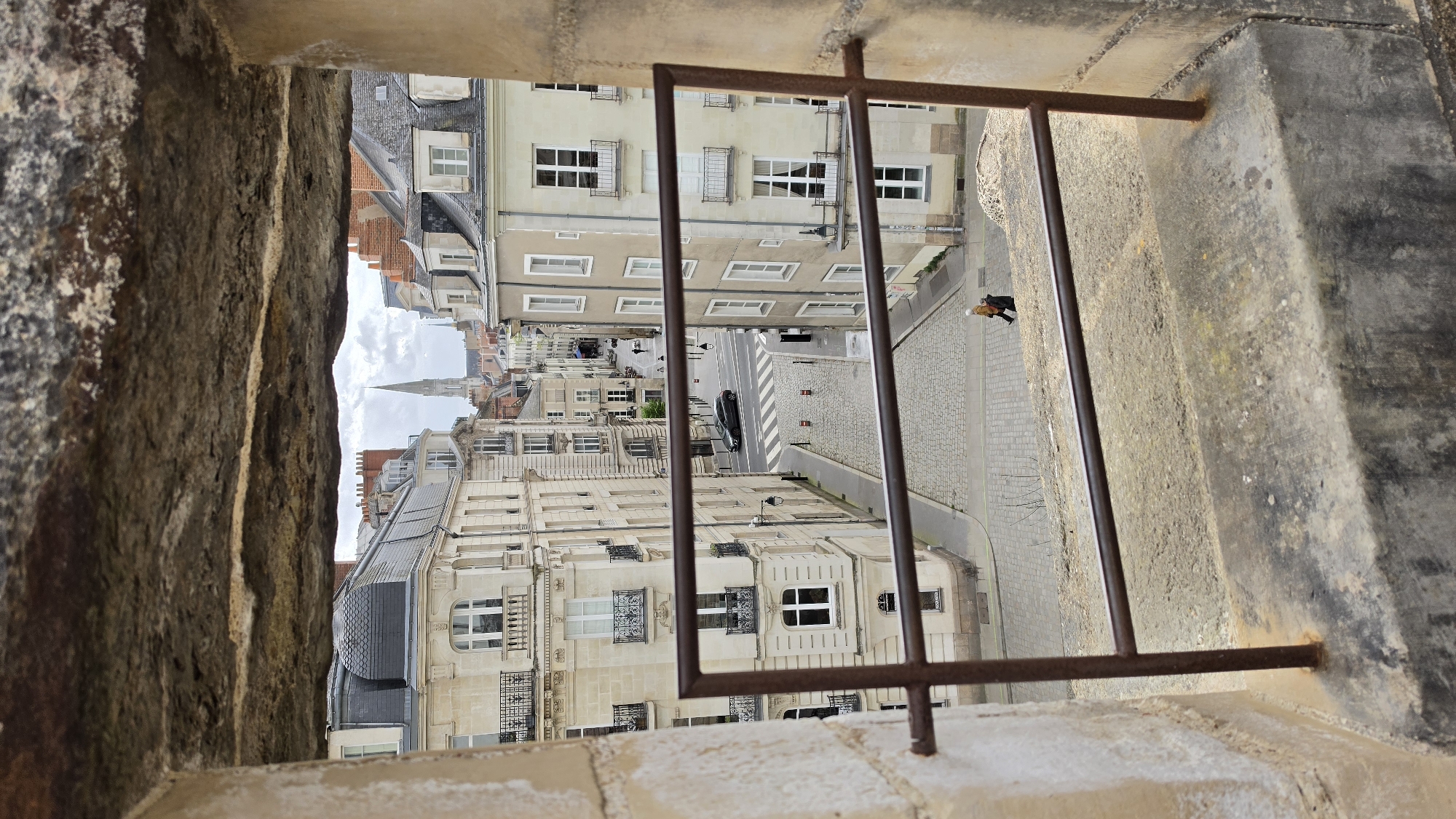 An elevated, downward-angled view frames a street scene in Nantes, France, likely from an opening within the Château des Ducs de Bretagne, looking towards the Cathédrale Saint-Pierre-et-Saint-Paul de Nantes. The immediate foreground consists of a rough-hewn, light-brown stone frame and a weathered, three-bar horizontal metal railing. Below the railing, a cobblestone street (likely Rue du Château) descends and intersects with an asphalt street featuring a white pedestrian crosswalk. A dark-colored sedan is parked on the asphalt section. Multi-story European-style buildings with light-colored facades, numerous windows (many with white frames), and ornate black iron balconies line both sides of the streets. Rooflines exhibit a mix of dark slate and red tiles, punctuated by dormer windows and chimneys. Two individuals are visible on the cobblestone street in the lower right; one person in a light-colored upper garment and dark lower garment walks alongside a smaller, darker figure. Further down the street, two indistinct human figures are also present. The background is dominated by the tall, pointed spire of the Cathédrale Saint-Pierre-et-Saint-Paul de Nantes, silhouetted against an overcast sky.