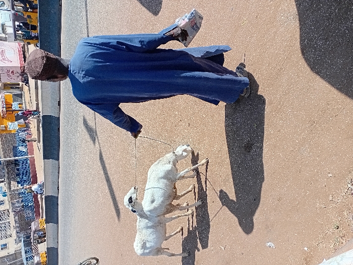 The scene is set outdoors in Dorayi, Nigeria, under direct sunlight, indicated by prominent shadows. In the foreground, a male individual is observed from behind, walking on a reddish-brown, speckled ground surface. He wears a long blue traditional garment and a dark brown cap. His right hand holds a thin rope which tethers two white sheep. The sheep, both with white wool, are positioned in front of the man, with the lead sheep having the rope around its head. The man carries a white plastic bag with visible markings in his left hand. Beyond the foreground, a paved road with a black and white striped median or curb is visible. In the background, multiple yellow auto-rickshaws (Keke Napep) are present, some parked. Several buildings line the street, including one with blue and white patterned barriers and another with a "Jocelyn" sign and a pink and white facade. Various other individuals are scattered throughout the background area.