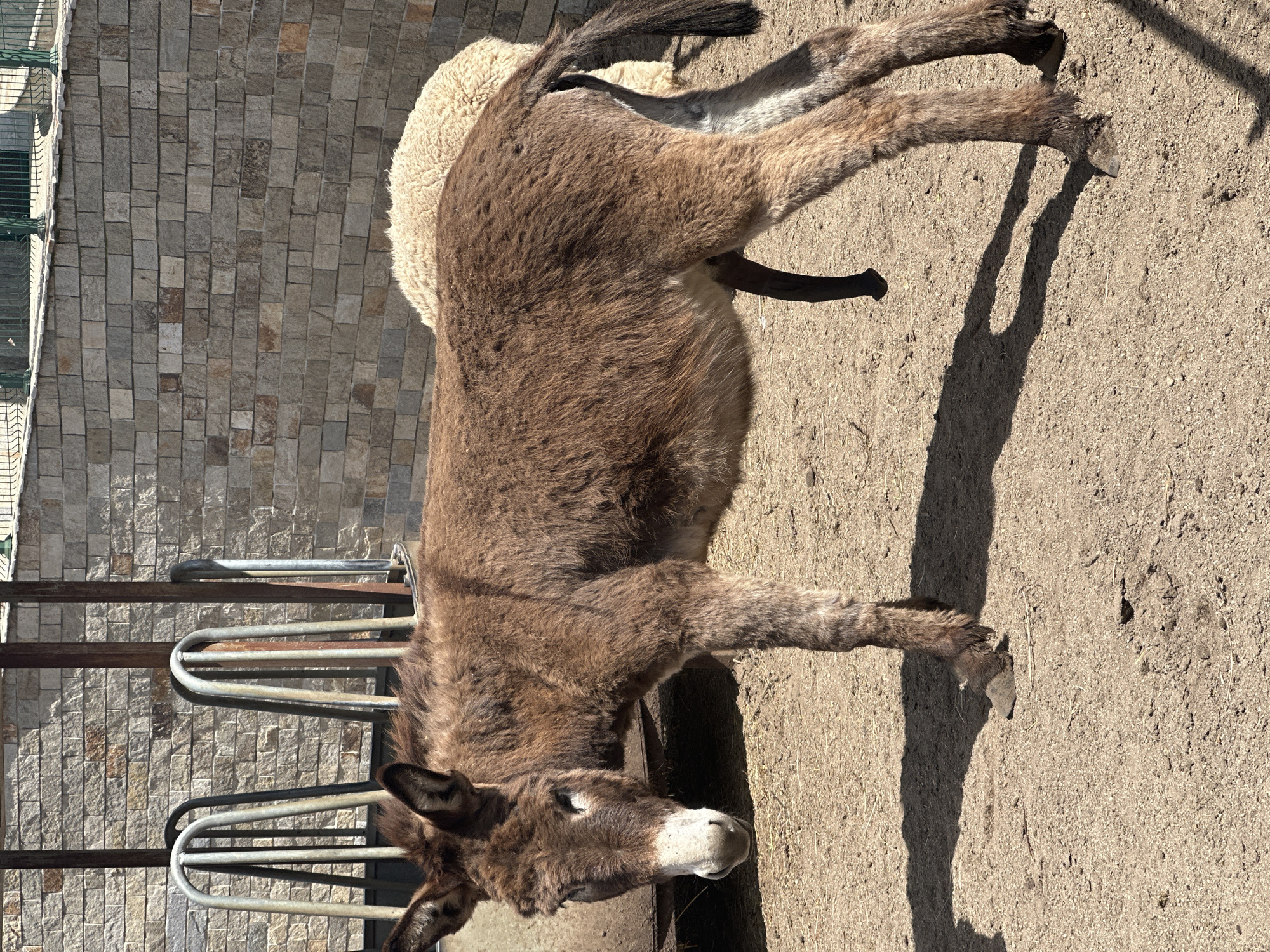 A donkey stands in a dirt enclosure. The donkey is brown with a white muzzle. A fleece jacket is draped over its back. To the left of the donkey is a metal gate. Behind the donkey is a stone wall. The location is Chernovrah, Bulgaria.