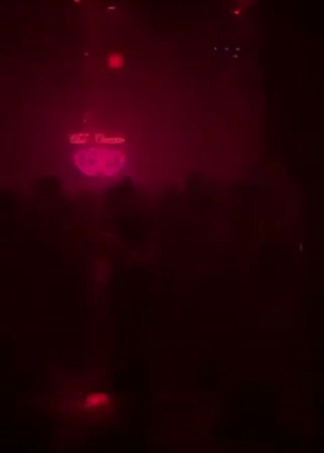 The video is taken in a dark nightclub environment, with red lighting and lasers flashing across the crowd