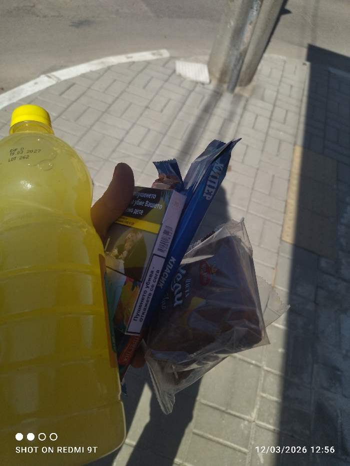 The image depicts an outdoor scene in Mirovyane, Bulgaria, captured on March 12, 2026, at 12:56 PM during daylight hours under bright sunlight. The primary subject is a light-skinned human hand holding several consumer items above a paved surface. The items held include: 1. A clear plastic bottle with a yellow screw-top cap, containing a translucent yellow liquid. Visible text on the bottle indicates "EXP D: 19 03 2027" and "LOT: 262". 2. A partially visible cigarette pack, predominantly yellow at the top, with a graphic health warning in Bulgarian below. Portions of the warning "ПУШЕНЕТО УБИВА - ОПАСНО ЗА ВАШЕТО НЕРОДЕНО ДЕТЕ" (Smoking Kills - Dangerous for your unborn child) and "ПУШЕНЕТО УБИВА - ОТКАЖЕТЕ СЕ СЕГА" (Smoking Kills - Quit now) are discernible. The word "КЛАСИК" (Classic) is also visible. 3. A dark blue wrapper, partially open at the top, displaying the text "КИТЕЕР" (likely "KITTER"). This wrapper appears to contain a solid snack item. 4. A dark brown, rectangular baked good, possibly a cake or pastry, enclosed in a transparent plastic bag. A small red and white logo is partially visible on the packaging. The background consists of a light grey paved surface (likely a sidewalk) composed of rectangular pavers. In the upper left, a portion of asphalt with a curved white line is visible, suggesting a road or parking area. A distinct yellow line runs along the right edge of the paved area. Strong, dark shadows are cast across the pavement from the person holding the items and an unseen overhead structure, indicating direct sunlight from the right. A dark, possibly metallic, vertical pole or structure is present in the upper right background.