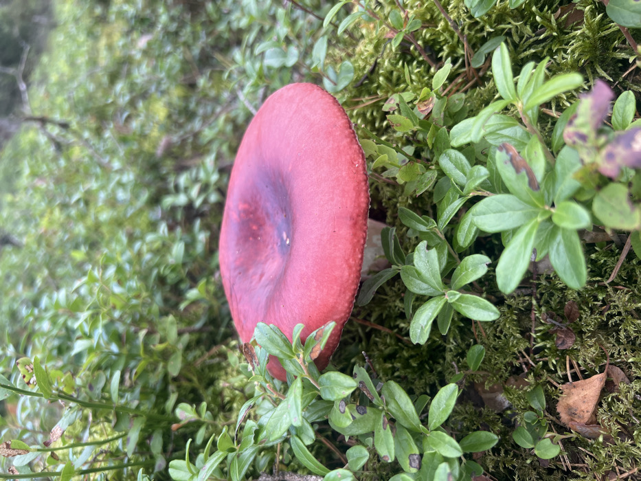 A close-up, ground-level photograph, taken in Petriškė, Lithuania, depicts a single mushroom situated amidst dense forest undergrowth. The mushroom, positioned centrally, features a broad, circular cap approximately 10-15 cm in diameter, displaying a vibrant reddish-pink hue on its outer edge that deepens to a darker, purplish-red in its slightly depressed center. A small portion of its off-white stem is visible directly beneath the cap. The mushroom is surrounded by a dense layer of bright green moss and numerous low-lying plants with small, ovate green leaves, consistent with Vaccinium species, some exhibiting minor brown discoloration or small perforations. The background consists of out-of-focus green foliage and blurred vertical elements suggestive of tree trunks, indicating a wooded environment. No individuals, animals, or specific actions are present in the scene; the image captures a static natural composition.