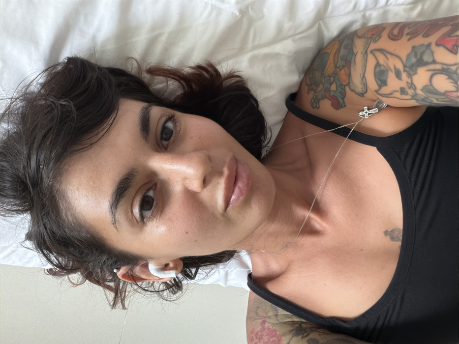 A person lies on a white pillow, angled to the camera. They wear a black tank top and a silver necklace with a small, decorative pendant. Tattoos are visible on both upper arms. Dark, short hair frames their face, and an earbud is in the left ear. They have fair skin, dark eyebrows, and are looking directly at the camera. The lighting is bright, and the overall composition is a close-up portrait.