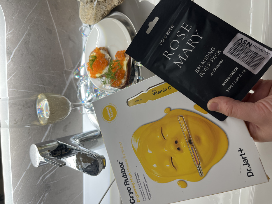 The scene presents a mix of self-care and indulgence. A wine glass stands near a modern chrome faucet, while a plate holds caviar sandwiches. Foregrounded, a hand presents two beauty products: a Dr. Jart+ Cryo Rubber Brightening Mask with Vitamin C and a Rated Green Rosemary Balancing Scalp Pack. The setting appears to be a luxurious bathroom, combining elements of relaxation and skincare routines.