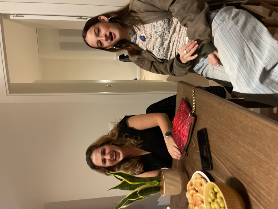 Two women are pictured indoors, likely at a social gathering. One sits at a wooden table on which is a red patterned purse, a phone, a potted snake plant, and a dish of snacks. She wears a black top and smiles widely. The other woman sits behind her, wearing a patterned top under a brown jacket and striped pants. She has jewelry and appears to be speaking. The setting is a well-lit room with a doorway visible in the background.