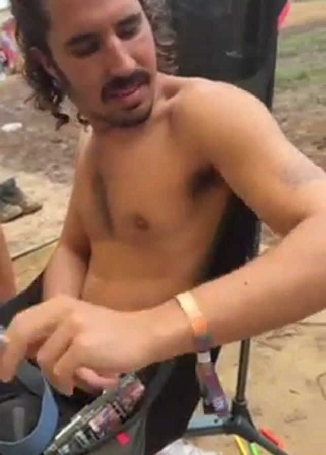 A man with long curly hair and a mustache sits shirtless in a black camping chair outdoors. He has a geometric tattoo on his left upper arm and wears a silver chain necklace and a wristband. He is smoking, and there is a can of drink in the chair beside him. The ground is muddy and littered with straws. People and tents are visible in the background.