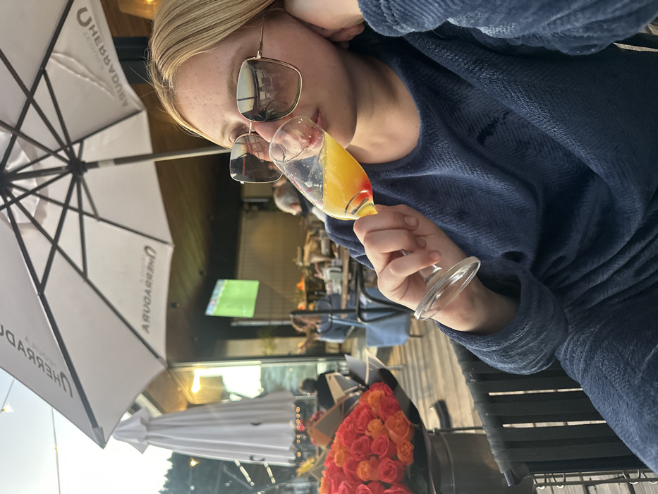 A woman in sunglasses and a blue robe sips a mimosa. A white umbrella labeled "The Boathouse" provides shade in an outdoor setting. Roses in orange and pink hues decorate the table. Other patrons sit at tables in the background. A television screen shows a soccer game in the back.