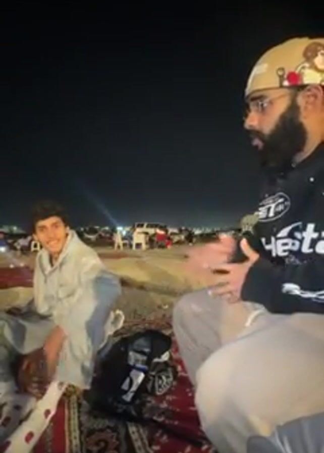 The video features a medium shot of three people sitting on a rug in an outdoor environment at night. On the left, a young man with curly hair wears a light grey tracksuit, patterned socks, and is giving a thumbs-up gesture. To his right, a black backpack rests on the rug. Across from him, a man with a beard and glasses is wearing a black hoodie with white designs and light grey pants. He appears to be speaking and gesturing with his hands. The third person is partially visible on the right side of the frame, wearing similar light grey pants. The background shows a flat, sandy area with scattered white folding chairs and vehicles parked in the distance under dim lighting. The sky is dark, indicating nighttime.