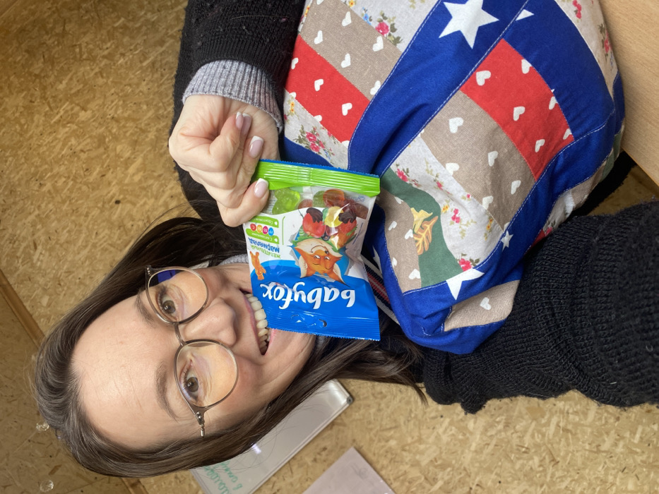 A female individual with brown hair and eyeglasses is depicted in an indoor setting with wooden paneling walls, identified as Ol'khovskoye, Russia. She is smiling broadly and looking directly towards the viewer. Her right hand holds an open blue package of "babyfox" brand gummy candies, which she is biting into with her mouth. The candy bag displays a cartoon fox and images of fruit, with text in Cyrillic indicating "JELLY MARMALADE." She wears a dark-colored, possibly black, knit garment over a lighter grey collar. A multi-patterned, quilted fabric object or pillow, featuring squares of blue with white stars, red with white hearts, and various floral or plain patterns, is visible beneath her left arm. A white board or paper with illegible Cyrillic writing is partially visible on the wooden wall behind her.