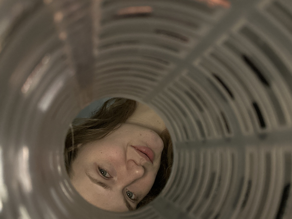 - "The image captures a female subject looking directly into the lens from an obscured perspective, framed by the interior of a translucent, ribbed cylindrical object" by FM-iSKVh2, licensed under CC BY 4.0