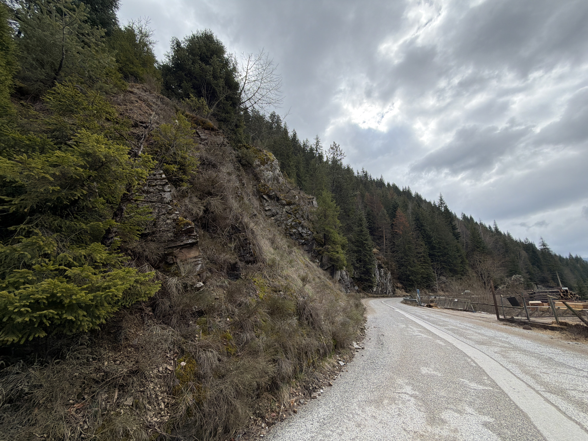 road winding along a hillside in a mountainous region. The road, made of gravel and asphalt, has a single white lane marking. To the left of the road, a steep slope is covered with vegetation, including evergreen trees, shrubs, and dry grasses. Rocks are visible along the slope. To the right of the road, dense evergreen forest covers the hillside. A wooden fence and lumber are visible near the road on the right side. The sky is overcast with gray clouds. Based on the given information, this scene is located near Shiroka Laka, Bulgaria. There are no people visible in the image.