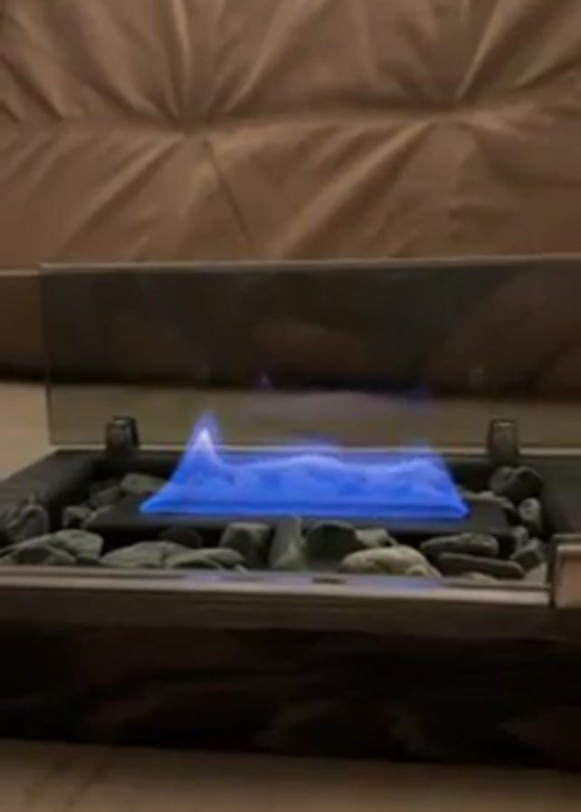 small, modern-style indoor fireplace burning with a blue flame