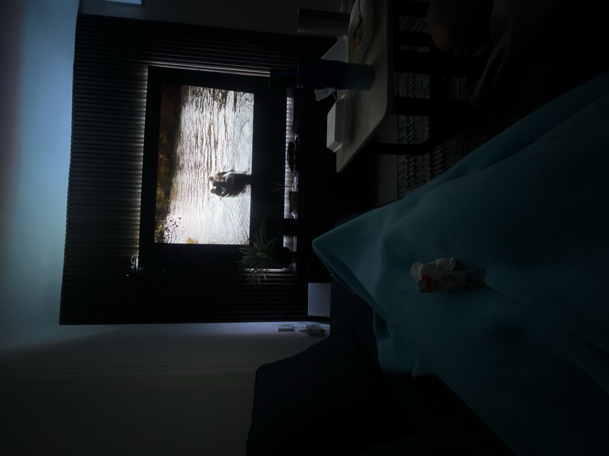 This image captures a dimly lit interior scene, identified as a residence in Mérida, Mexico. The primary focal point is a large television screen displaying a scene with two individuals in a canoe on a body of water. The television is centrally mounted against a dark, vertically slatted wooden panel, illuminated by a strip of light along its upper edge. Above the screen, a cool blue light illuminates the ceiling. Below the television, a dark credenza holds a potted plant with spiky green leaves, two clear glass decorative vases, and other indistinct dark objects. To the left of the television setup, a white wall-mounted device, possibly a router, is visible with associated wiring, and a light-colored object, resembling a laptop, rests on a surface below it. In the foreground, the lower body of an individual, likely reclining, is largely obscured by a teal-colored blanket or fabric, filling the left side of the frame. A crumpled white tissue or napkin is resting on this blanket. To the right, a rectangular light-colored table holds two white styrofoam takeout containers, one closed and one open, displaying food. A blue-to-teal gradient tumbler with a straw stands next to them. A dimly discernible figure, likely a second individual, occupies the lower right corner of the frame, mostly in shadow. A dark patterned rug is visible under the table. The overall scene suggests a relaxed evening setting with television viewing and dining.