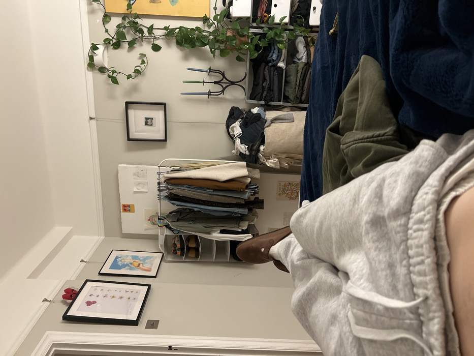 A person sits in gray sweatpants and brown sandals, partially obscuring a closet area. The wall holds framed artwork, including a botanical print and a blue-toned painting. A clothes rack is filled with folded garments and shoes. Above, a vine drapes across the top, complemented by a candle holder and another framed print. Clothing hangs within a closet organizer, partially hidden behind a blue garment and a green jacket.