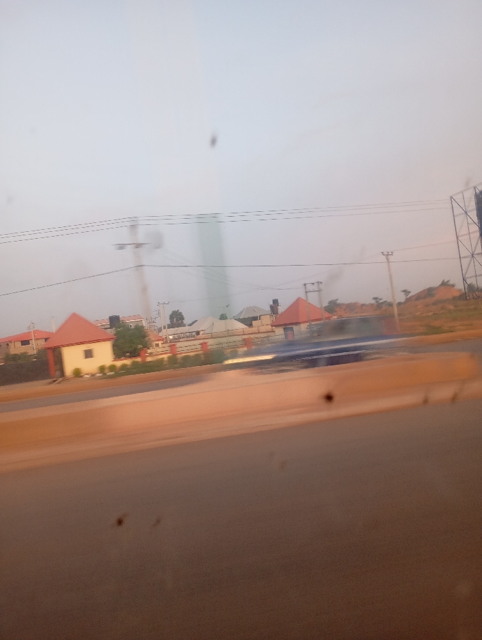 A daytime outdoor scene features structures and infrastructure. Several small buildings with red, pointed roofs are visible behind a low, dark fence. Overhead power lines stretch across the top portion of the image, supported by wooden utility poles. To the right, a metal structure with a framework is present. In the foreground, there is a dusty surface. The image appears to be taken from inside a moving vehicle, evidenced by blurred portions and specks on a surface, likely a windshield.
