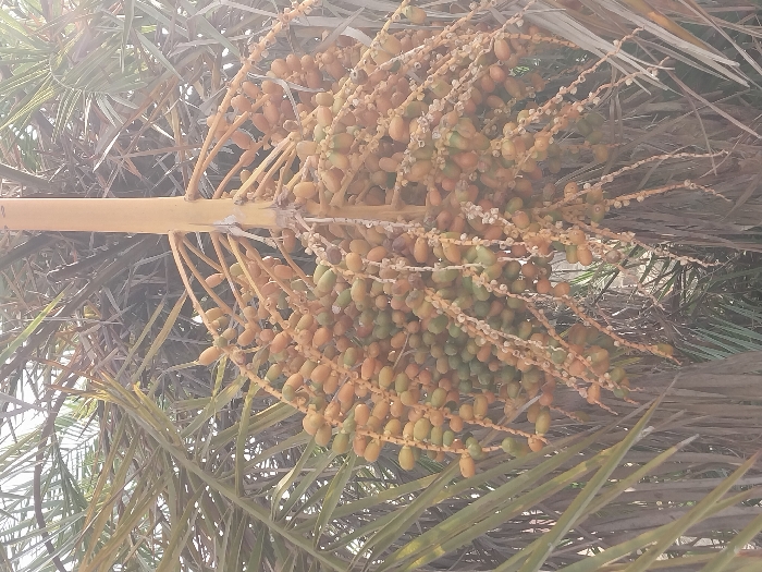 - "A dense cluster of ripening dates hangs from a central, thick yellow stem of a date palm tree, located in Barikin Jirga Summa, Nigeria" by FM-jdFGd2, licensed under CC BY 4.0