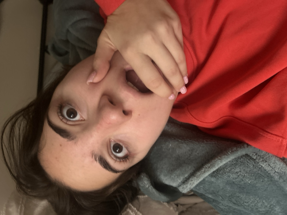 A forensic examination of the image reveals a close-up, tilted portrait of a young individual, likely female, exhibiting an expression of surprise or shock. The subject has dark hair, wide-open dark eyes, and an open mouth. The right hand, with fingers featuring light pink, possibly glittered, nail polish, is positioned across the lower face, covering the chin and mouth, with the thumb near the left cheek. The individual is wearing a red long-sleeved garment, likely a sweatshirt or top. The background consists of a textured, light blue or grey blanket on the left and a darker, possibly patterned, light-colored fabric or pillow further left. A dark, horizontal linear object, possibly a bed frame or headboard, is visible in the upper right background. The scene appears to be an indoor, domestic setting. The image provides no visual cues to confirm a location within the city of Schiltigheim, France.