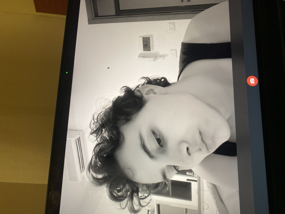 A grayscale portrait of a person with curly hair, shown on a monitor screen