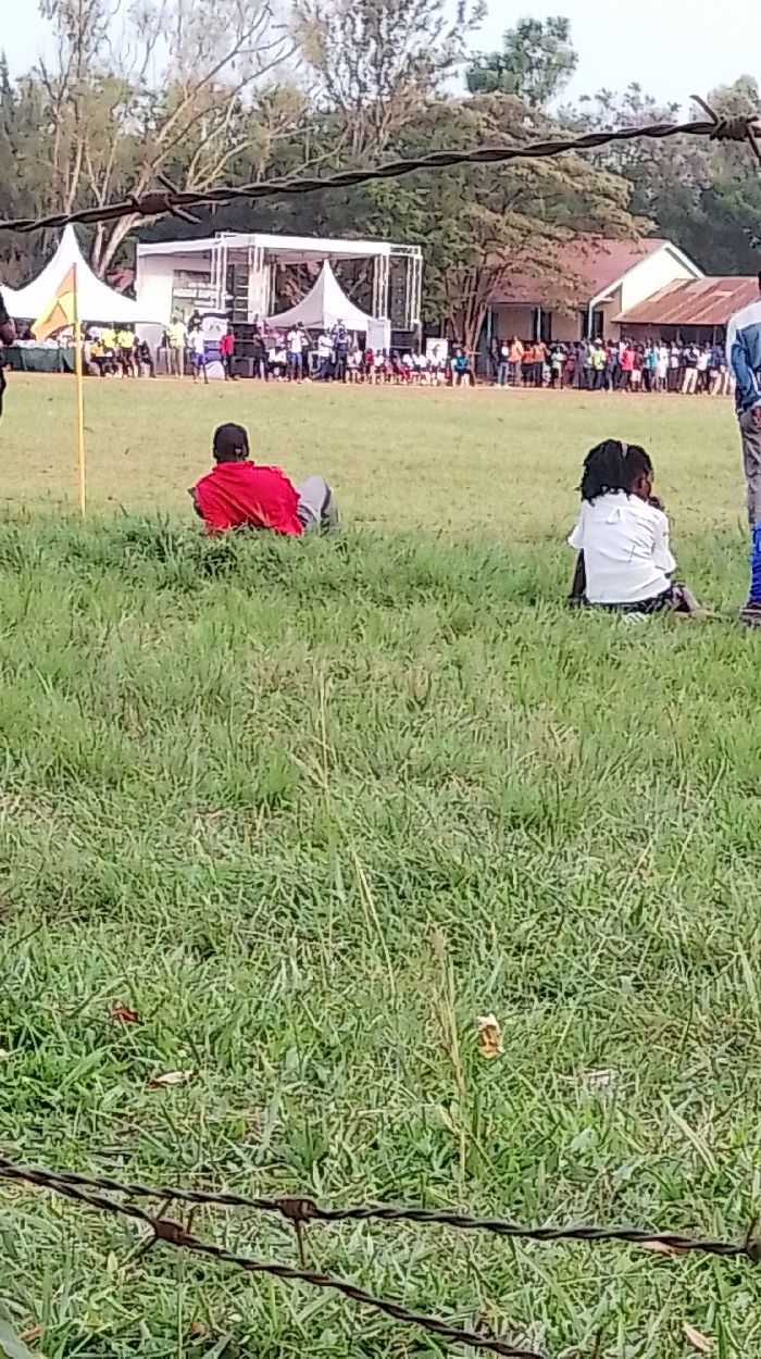 The image depicts an outdoor public gathering in Siaya Township ward, Kenya, viewed from a slightly elevated position behind a barbed wire fence. The foreground features a two-strand barbed wire fence running horizontally across the bottom, in front of a wide expanse of green grass. In the left-center foreground, an individual in a red shirt and grey pants is lying prone on the grass, facing towards the left. To their right, another person with dark hair, wearing a white shirt and dark trousers, is seated on the grass, facing away from the camera. A yellow flag on a pole is visible in the mid-left, partially obscured. In the mid-ground, a large group of people is assembled around a white outdoor stage structure with prominent speaker systems on either side. Multiple white canopy tents are erected around the stage, one on the left displaying an orange banner. The crowd is composed of individuals standing and seated, many in light-colored attire, facing the stage. The background includes several light-colored buildings with reddish-brown corrugated roofs, situated amidst numerous mature trees with green foliage, under a bright sky.