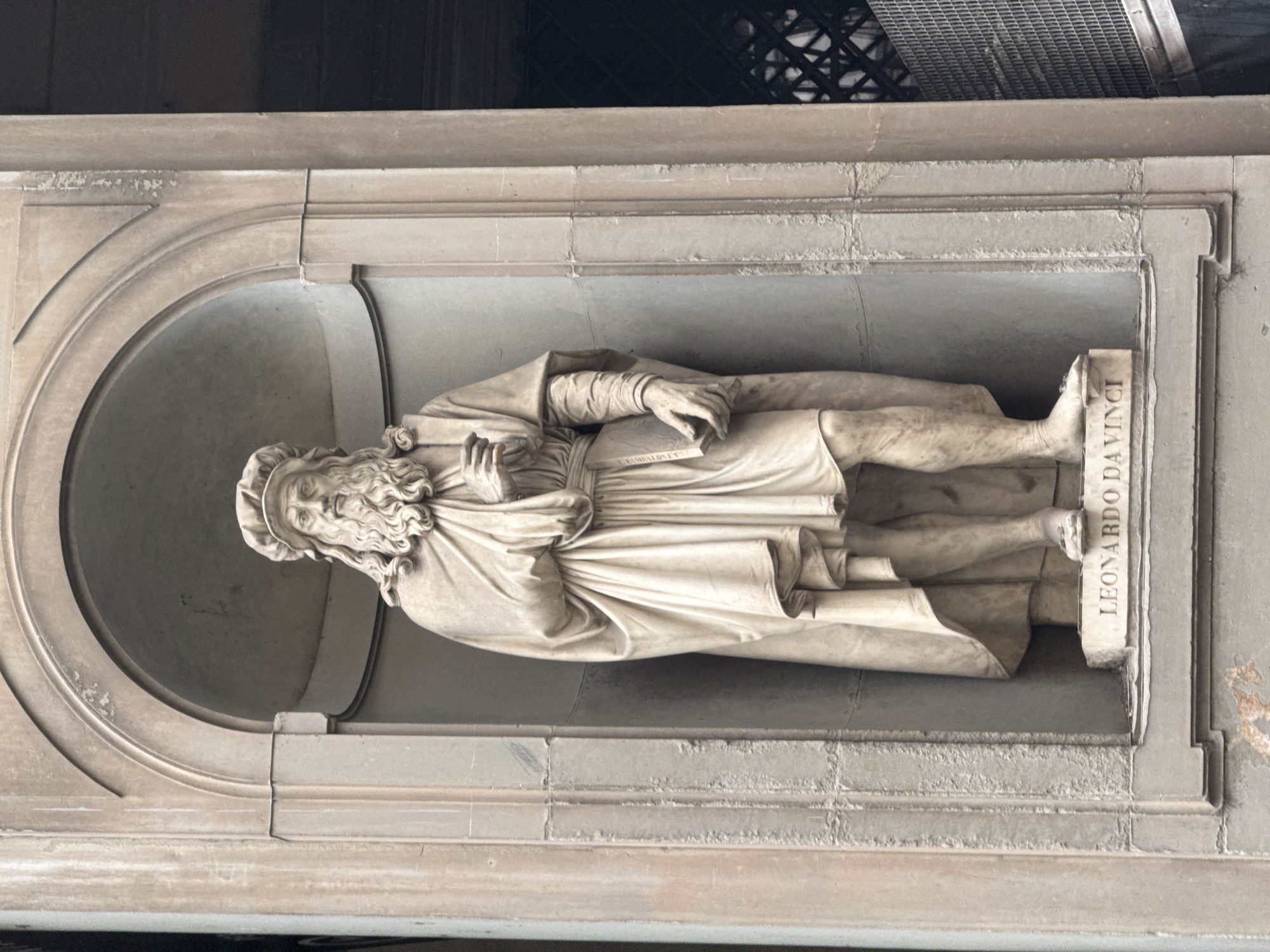 - "The image presents a full-body marble statue of Leonardo da Vinci, situated within an arched stone niche on an exterior building facade" by FM-6dKsK2, licensed under CC BY 4.0