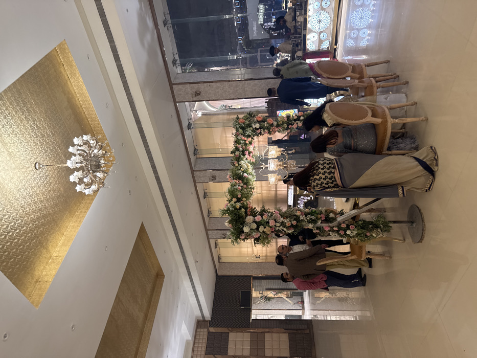 A group of people stands before a floral archway indoors. Chairs line the space behind them. Above, a golden panel with a chandelier hangs from the ceiling. Large glass windows reflect interior scenes. The scene suggests a formal event or gathering in a spacious hall.