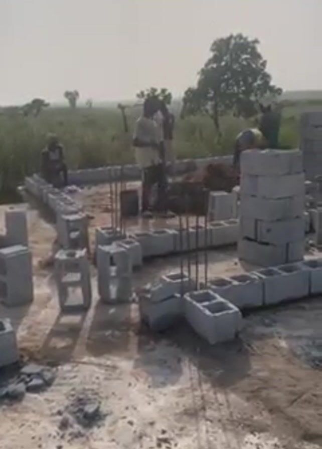 construction site where a group of workers are building the foundation of a structure using concrete blocks. The foundation layout is visible, with the blocks arranged in a pattern indicating the shape of the building. Some blocks are stacked to create pillars. Reinforcement rods are visible within some of the blocks. One worker can be seen mixing materials, likely mortar, while others are laying the blocks. The site appears to be in a rural or semi-rural area, with a flat landscape and vegetation in the background. The sky is overcast.