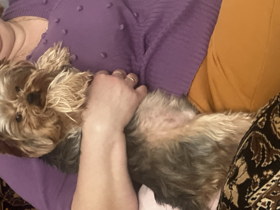 A close-up image depicts a small, long-haired dog, likely a Yorkshire Terrier, being held by an individual. The dog is positioned centrally, facing the viewer, with a multi-toned coat displaying shades of golden-brown on its head and limbs, transitioning to darker grey/black on its back, and lighter tan/cream on its belly, which exhibits some visible skin with faint red marks. Prominent, lighter-colored facial hair frames its dark eyes and nose. The scene involves parts of at least two human subjects. A light-skinned arm and hand are visible, cradling the dog. This hand wears two plain gold-colored rings on its ring finger. To the right, the upper torso and neck of another individual are visible, clad in a textured purple knitted sweater adorned with small, raised bobbles. A sliver of the individual's chin is discernible at the top right. Below the purple sweater, an orange fabric, consistent with trousers, is visible. At the bottom left, a dark brown fabric with a lighter abstract pattern is present, possibly a blanket, cushion, or another person's attire. The interaction suggests the dog is being held or petted in an indoor setting. The image provides no specific details to determine a precise location within the city of Пугачёво, Russia.