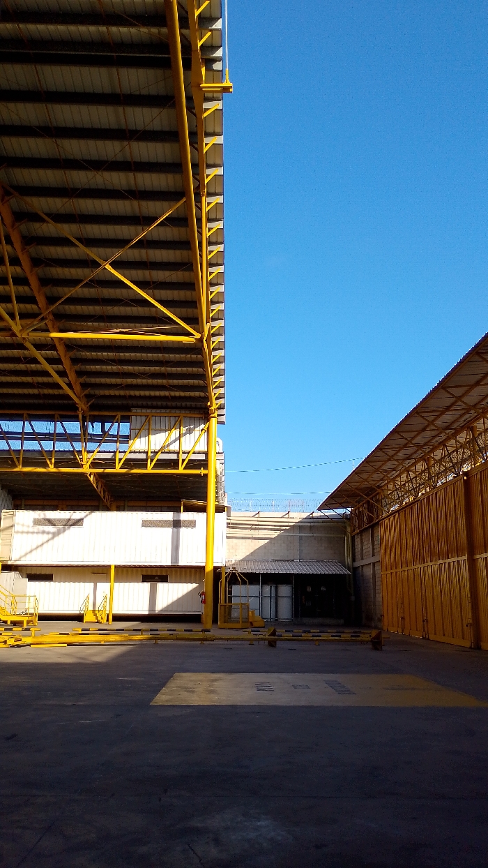 n industrial area with two large, open-sided structures featuring yellow metal frames and corrugated roofs
