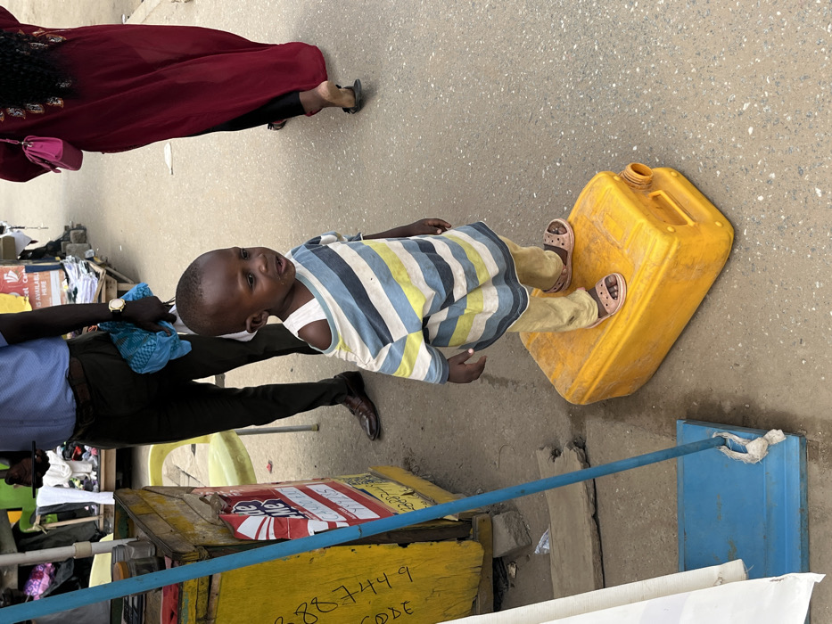 This image depicts a street scene in Ablekuma, Ghana. A young, dark-skinned child stands centrally on a rectangular, worn yellow plastic jerrycan. The child wears an oversized, off-the-shoulder horizontal striped shirt (white, blue, yellow), light brown pants, and light brown sandals, looking towards the right with a slightly open mouth. Behind and to the left of the child, a man is visible from the waist down, wearing a light blue collared shirt, dark trousers, and dark brown leather shoes. He holds a dark object in his right hand and a light blue patterned bag in his left; a gold watch is on his left wrist. To the far right, a woman in a long red dress or abaya, dark pants, and dark flip-flops walks away, carrying a pink handbag on her left shoulder. On the left side of the frame, a yellow wooden stall or kiosk displays red and white branding ("De Me," "CASHOUT") and handwritten numbers. A light green plastic chair is partially visible behind the stall. A blue pole, possibly supporting a canopy, extends upwards from a blue base in the immediate foreground, with a white fabric element attached. The ground is a grey paved surface, likely asphalt or concrete. No direct interaction is observed among the individuals.