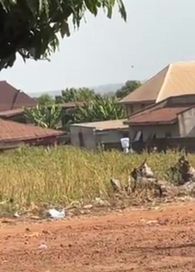 The camera is behind a fence or a door, focusing on a residential area in what appears to be a rural setting. Several houses with different roof styles, including a distinctive light-colored roof, are visible. Overgrown vegetation fills the spaces between the houses. A person wearing a blue garment that covers their head and body is seen walking across a red dirt path. The sky is overcast, and some trees are visible in the foreground.