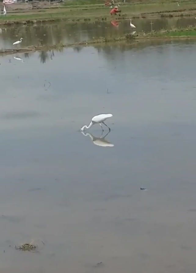 flooded rice paddy field, where a white egret stands in the water, casting a reflection. The egret dips its head into the water, possibly hunting for food. In the background, other egrets are visible in different areas of the field, along with people working. Palm trees and buildings are seen in the far background, suggesting a rural or agricultural setting. The sky is overcast, and the water surface is relatively still.