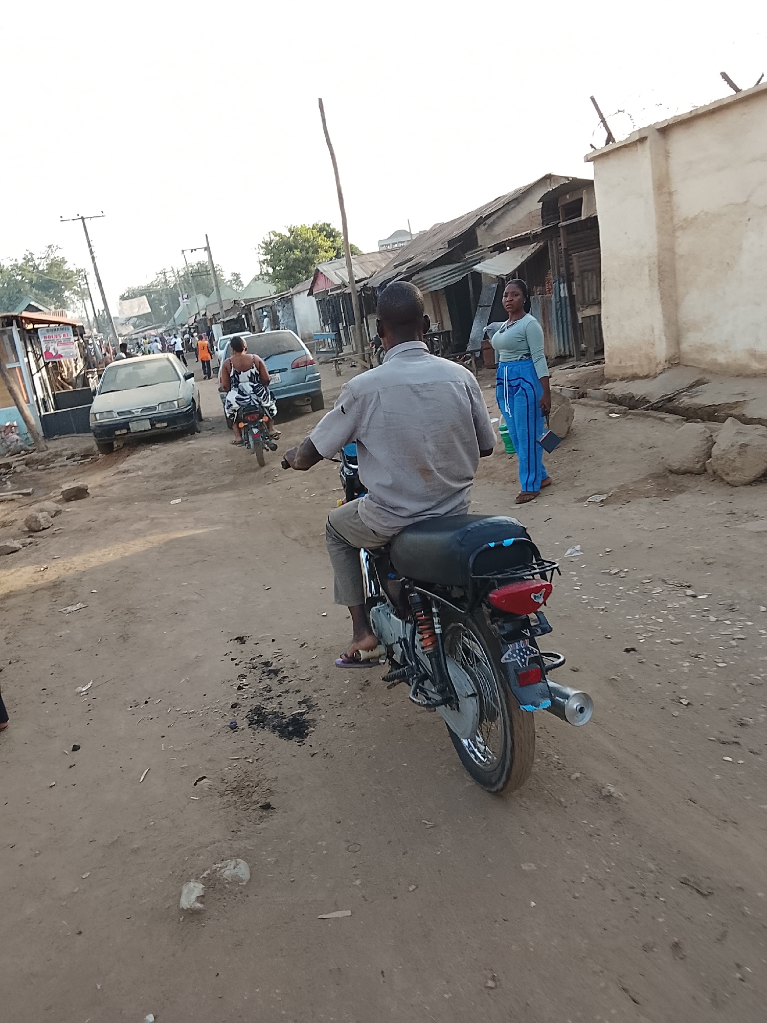 The image depicts a daytime urban street scene in Abuja, Nigeria. The unpaved road surface is composed of dirt, showing scattered debris, small rocks, and patches of dark stains. In the immediate foreground, a male individual is seen from behind, riding a black motorcycle. He wears a light-colored, short-sleeved collared shirt, light-colored trousers, and purple flip-flops. The motorcycle features a red taillight and a silver exhaust pipe. To the right of the foreground motorcycle, a woman walks leftward, facing partially towards the center of the road. She is dressed in a light blue long-sleeved top and blue track pants with a lighter vertical stripe. She carries a dark, rectangular object in her left hand and a light green plastic bottle in her right hand. Further down the street, another individual, possibly a woman wearing a patterned sleeveless top, is also riding a motorcycle away from the viewer. Behind this motorcycle, a light blue sedan is visible. On the left side of the road, a light-colored sedan is either parked or moving slowly. The street is bordered by various structures. On the left, a series of informal buildings are constructed with wood and corrugated metal sheets. Utility poles with overhead wires are also visible on this side. On the right, a light-colored concrete wall, topped with barbed wire, runs parallel to the road, with more informal structures visible behind it. The sky is bright and appears hazy or overcast.
