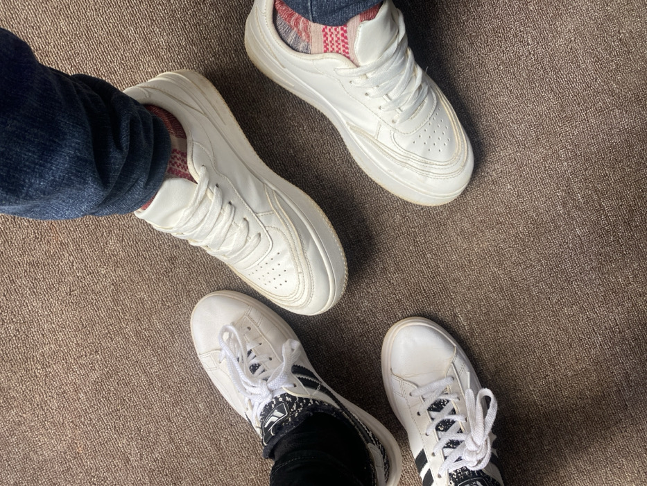 An overhead shot captures the lower extremities of two individuals on a light brown, short-pile carpet. On the left, a person displays two feet wearing matching white low-top sneakers featuring black three-stripe branding on the sides and a black and white geometric pattern around the ankle trim. White laces are present on both shoes. On the right, another person's two feet are visible, each encased in a white, slightly bulky sneaker with white laces. Above these sneakers, patterned socks in shades of red, white, and possibly blue or purple are visible, extending into the cuffs of blue denim jeans. All four feet are static on the carpet, suggesting the individuals are standing or seated.