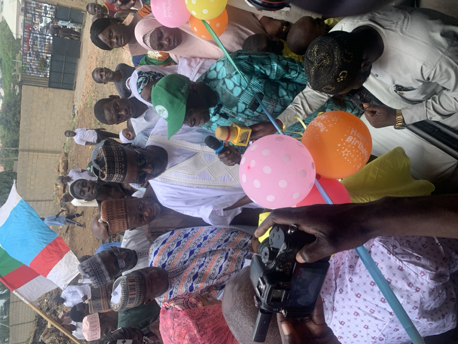 A dense outdoor gathering is depicted in Gwong, Nigeria, featuring approximately two dozen individuals, predominantly adults, under natural daylight. The central focus is a man in a green baseball cap and a teal patterned kaftan, actively speaking into two microphones—one blue and black, the other yellow-brown with a black head—held in his right hand. He faces slightly right. To his left stands a man in a white kaftan, dark sunglasses, and a patterned cap, looking forward. Surrounding these figures is a crowd of men and women dressed in a mix of traditional Nigerian attire and casual wear, many wearing patterned caps or head coverings, observing the speaker. In the immediate foreground, a pair of dark hands holds a black DSLR camera, oriented towards the central figures, capturing the event. Below the camera, a pink balloon with white polka dots and an orange balloon adorned with white stars and "Happy Birthday" text are suspended. The background reveals a light-colored concrete block wall and a dark metal gate to the right, behind which vehicles are indistinctly visible. To the left, a large flag displaying horizontal stripes of green, white, red, and light blue is mounted on a pole, rising above a pile of debris. The ground consists of unpaved earth. The scene suggests a public event, possibly a press briefing, political rally, or community celebration.