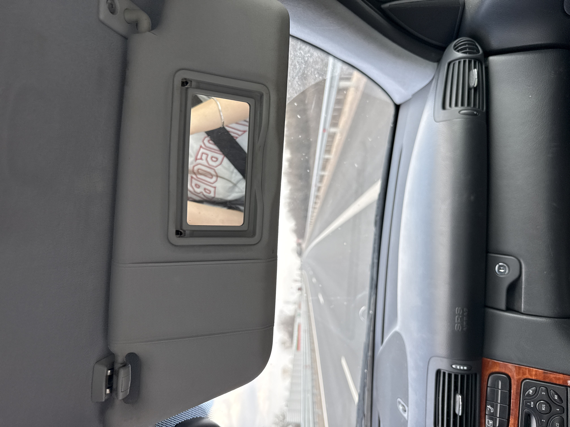 The scene depicts the interior of a moving vehicle, viewed from the front passenger area looking forward. Overhead, a light grey fabric sun visor on the passenger side is lowered, featuring an open vanity mirror. The mirror reflects the upper torso and right arm of an individual. This individual wears a white short-sleeved garment with mirrored red lettering, appearing as "BOЯ." A black seatbelt is visible across the chest, and a silver-colored bracelet adorns the right wrist. Below the windshield, the vehicle's dashboard is black, displaying an "SRS AIRBAG" emblem on the passenger side. Rectangular air vents are present on both the passenger and driver sides. Part of the center console, featuring a dark wood-grain trim and various control buttons (e.g., for radio functions like FM, RDS, CD, AM), is visible on the driver's side. The windshield shows minor streaks or smudges. Through the windshield, an asphalt highway stretches into the distance under an overcast or hazy sky. White dashed lines mark the lanes, and solid white lines define the shoulder. Metal guardrails line both sides of the road, beyond which sparse, leafless trees or brush are visible. The vehicle is in motion on this highway, located in or near Herakovo, Bulgaria.