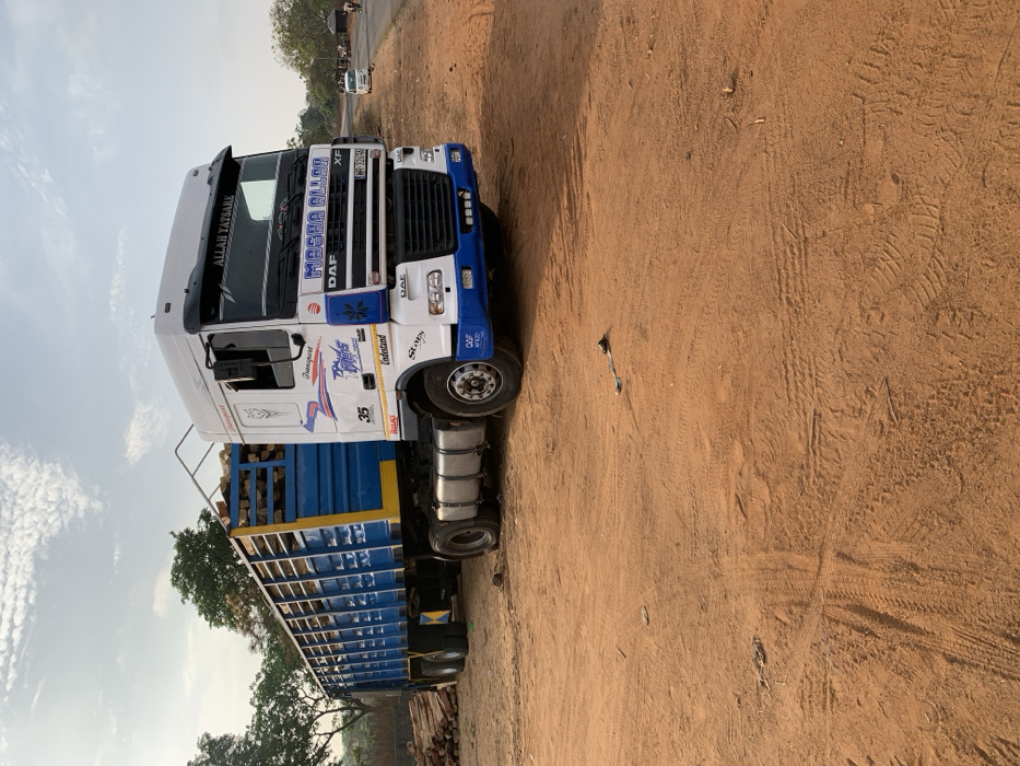 A DAF truck, loaded with timber, stands on a dirt road