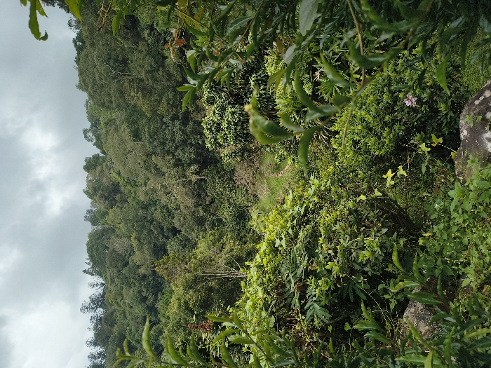 Lush greenery dominates the landscape. A densely forested hillside rises in the background under a cloudy sky. In the foreground, vibrant foliage including leaves, branches, and various plants fills the view. A narrow, winding path cuts through the dense vegetation, leading towards the distant hillside. Scattered rocks and a single purple flower can be seen among the plants.