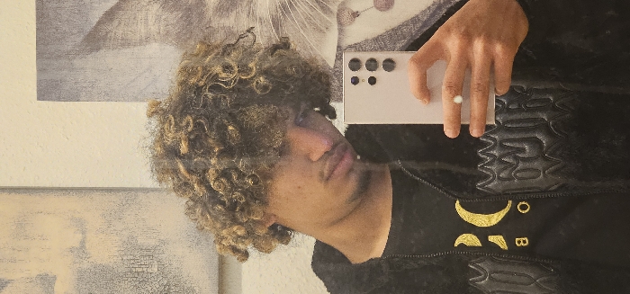 A person with curly brown hair holds a white smartphone, adorned with multiple camera lenses, at eye level. The individual is wearing a black shirt or jacket with gold-colored detailing. In the background, a wall displays a piece of abstract art. The subject's face is visible, suggesting a selfie is being taken. A ring with a pearl-like bead is visible on one of the subject's fingers.