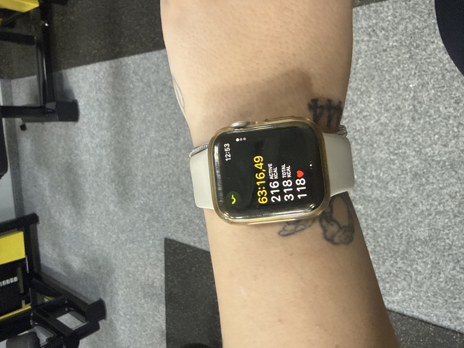 A close-up image shows a person's left forearm and wrist, centrally featuring a smartwatch. The smartwatch, protected by a gold-tinted case and fitted with a light-colored band, displays workout metrics on its black screen. The current time, "12:53," is visible in the upper right corner. Below this, "63:16,49" indicates a duration, followed by "216 ACTIVE KCAL" and "318 TOTAL KCAL." A heart rate of "118" bpm is displayed with a red heart icon. A green icon, suggesting an active workout, is present in the top left of the watch face. A silver-colored chain or bracelet is partially visible on the wrist next to the watch. A small, dark-ink tattoo, depicting what appears to be a winged figure or emblem, is visible on the inner forearm beneath the watch. The background consists of a grey speckled floor, consistent with gym flooring, and blurred elements of black and yellow exercise equipment. The exact location within the city of Veliki Preslav, Bulgaria, is not discernible from the provided visual data.
