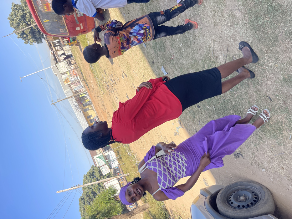 The image depicts a roadside scene in Zaria, Nigeria, under clear daylight. Four individuals are present on a dusty, sparsely vegetated ground. On the left, a woman wearing a purple headwrap, a purple off-shoulder top with a patterned front, a matching purple skirt held up slightly by her right hand, and silver-strapped sandals, looks directly towards the viewer. She carries a light-colored shoulder bag. To her right, a second woman, facing partially away from the viewer towards the right, wears a red long-sleeved shirt, a black knee-length skirt, and black flat shoes. Her dark hair is pulled back, and her arms are crossed over her chest. Further to the right, a young boy with short hair wears a multi-colored long-sleeved shirt featuring animated characters, dark jeans with light accents, and orange sandals. His left hand is raised towards his chin, and he looks towards the far right. Partially obscured by a red commercial mini-bus or van on the far right, a second young boy wears a white t-shirt with blue trim and looks towards the first boy. The mini-bus displays "BEN" on its license plate and has text visible on a rear window sticker. In the background, a series of single-story commercial-style buildings are visible, some with corrugated roofs, and one with green and white signage, possibly indicating "THE BELIEVERS CHRISTIAN CHURCH." Utility poles with multiple overhead wires traverse the scene against a clear blue sky. A silver car is partially visible on the far left. The ground is dry earth with scattered debris.