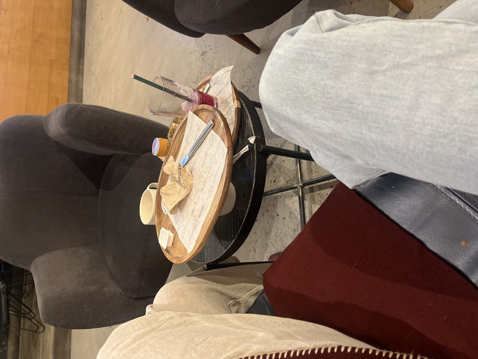 The scene depicts a cafe interior, specifically a Starbucks in Vila Nova de Gaia, Portugal. A small, dark, circular side table is centrally positioned, bearing two stacked oval wooden trays. The top tray holds a crumpled Starbucks-branded paper napkin, a silver knife, a small white rectangular container, an orange small container, and a light-colored ceramic mug with residual contents. The lower tray features a clear glass containing remnants of a dark pink beverage and a green straw. Two individuals are partially visible: on the left, a person is seated, wearing light beige fabric with a vertical patterned trim over a maroon garment; on the right, the legs of another person are visible, clothed in light blue jeans. An unoccupied dark gray armchair is present in the background.
