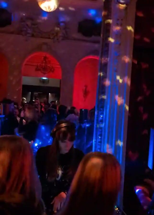 bustling party scene indoors. A DJ, wearing a black shirt and a cap, is mixing music at a booth. There are many people visible, some with their backs to the camera, suggesting a crowded environment. Overhead, a disco ball casts speckled light around the room, mixing with blue and red stage lighting. The space has an ornate architectural style with arched doorways painted red. Confetti appears to be falling, adding to the celebratory atmosphere.