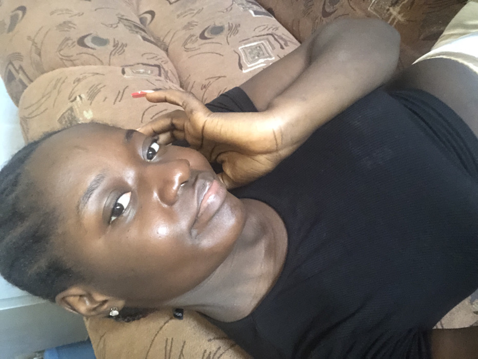 A single adult female is depicted in a chest-up, slightly angled shot, looking directly towards the camera. She has dark skin and her dark hair is styled in braids. A small, dark-colored ring pierces her septum. A light-colored stud earring is visible in her left earlobe. Her right hand is raised, with fingers resting against the right side of her face/temple area; the fingernails on this hand are painted red. She is wearing a black, short-sleeved crop top with a ribbed texture, revealing a portion of her abdomen and a light-colored garment underneath. The individual is seated or reclining on a sofa, visible behind her, which features light brown upholstery with a repeating darker brown geometric pattern. A blue object is partially visible in the blurred background to the left. The scene is located in the city of Rido, Nigeria.