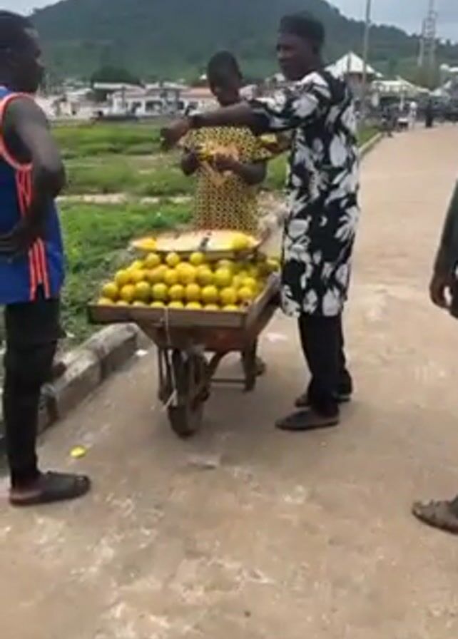 The scene presents a street setting with four individuals and a wooden cart loaded with yellow citrus fruits, likely oranges. The cart is positioned on a paved area adjacent to a road or street. The backdrop features a lush, green mountain, suggesting a rural or semi-rural location. One man, wearing a blue and orange basketball jersey and black pants, stands on the left side of the frame, with his hand on his hip, and he is wearing black sandals. A second man, dressed in a black and white patterned robe-like shirt, black pants, and black shoes, is seen interacting with a third person, who is dressed in a yellow patterned shirt. The individual in the patterned robe appears to be selecting or handling oranges from the cart. On the right side of the frame, a person clad in a green uniform or suit stands partially visible, adding an element of authority to the scene.